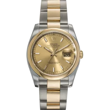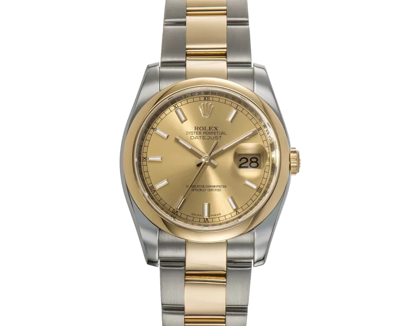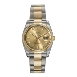 Rolex Datejust 116203 36 mm, Stainless steel/Gold case and Oyster strap, Yellow gold bezel, Fold clasp, Champagne dial, Automatic movement, Movement/Caliber 3135, 10 ATM water resistance with original box, original papers and is in perfect working conditions. This watch has been checked, certified and carried out the water resistance test and has 2-year warranty from the date of purchase.