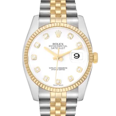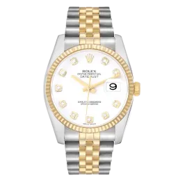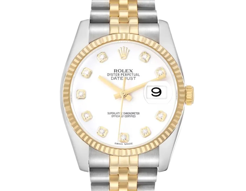 Rolex Datejust 116233 Movement : Automatic Case size : 36mm Case material : Steel & Yellow Gold Bracelet material : Steel & Yellow Gold (Jubilee) Dial type : White Diamond Water resistance : 100 Metres