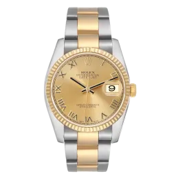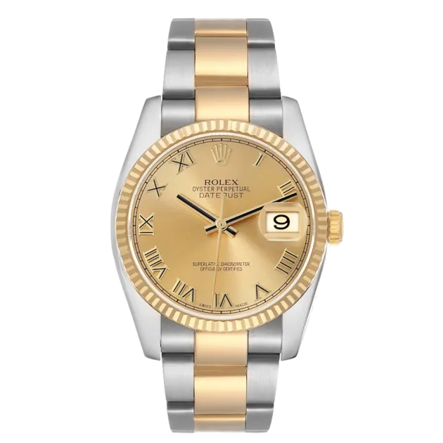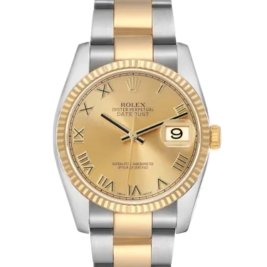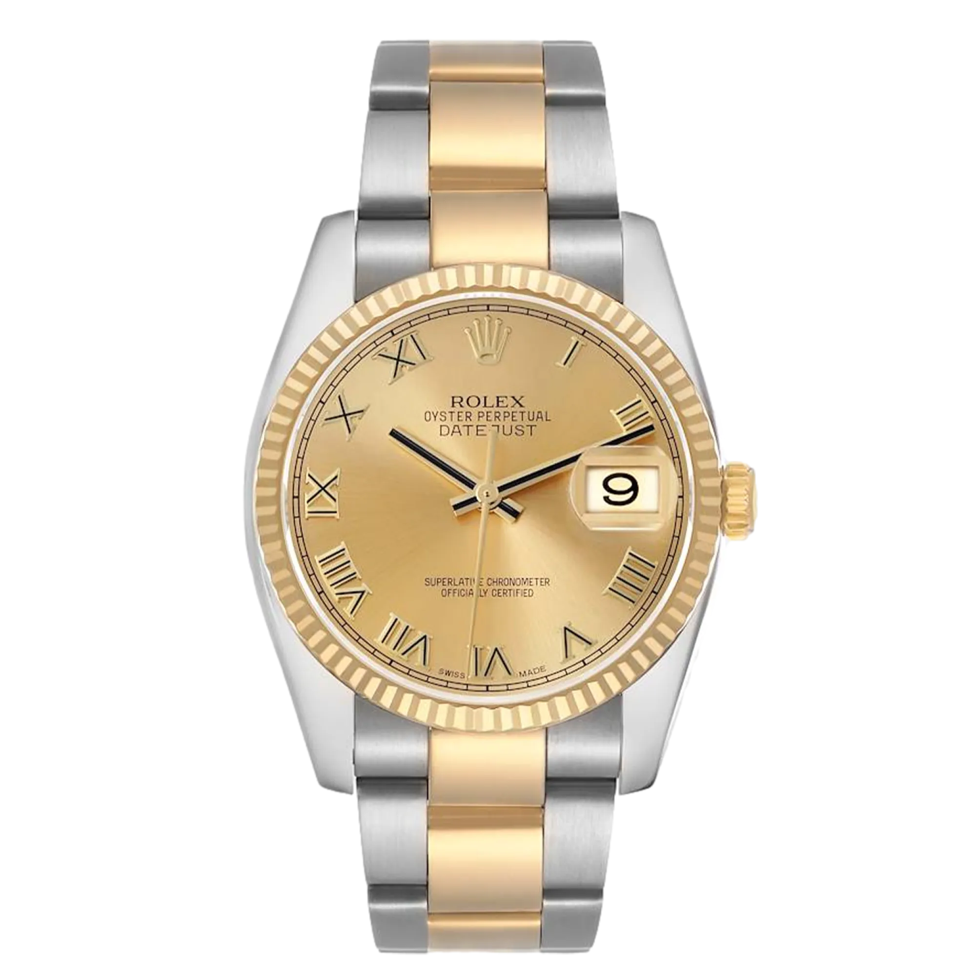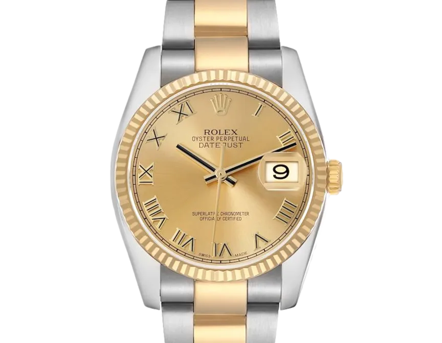 Rolex Datejust 116233 Movement : Automatic Case size : 36mm Case material : Steel & Yellow Gold Bracelet material : Steel & Yellow Gold (Oyster) Dial type : Champagne Roman Numeral Water resistance : 100 Metres