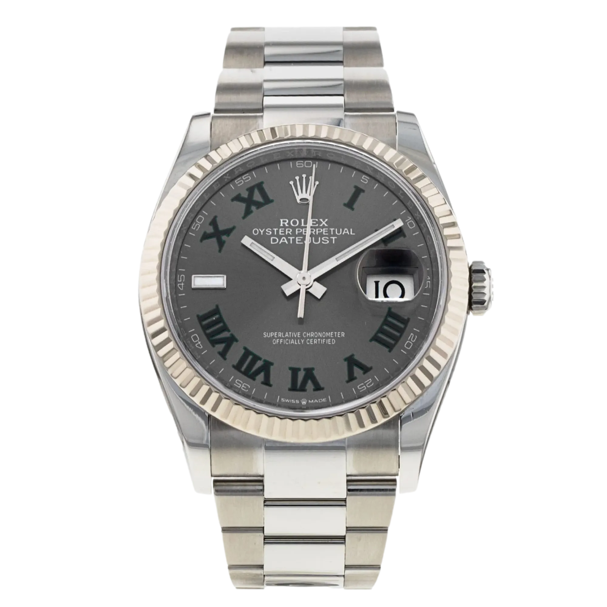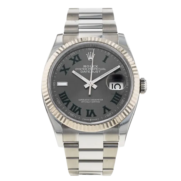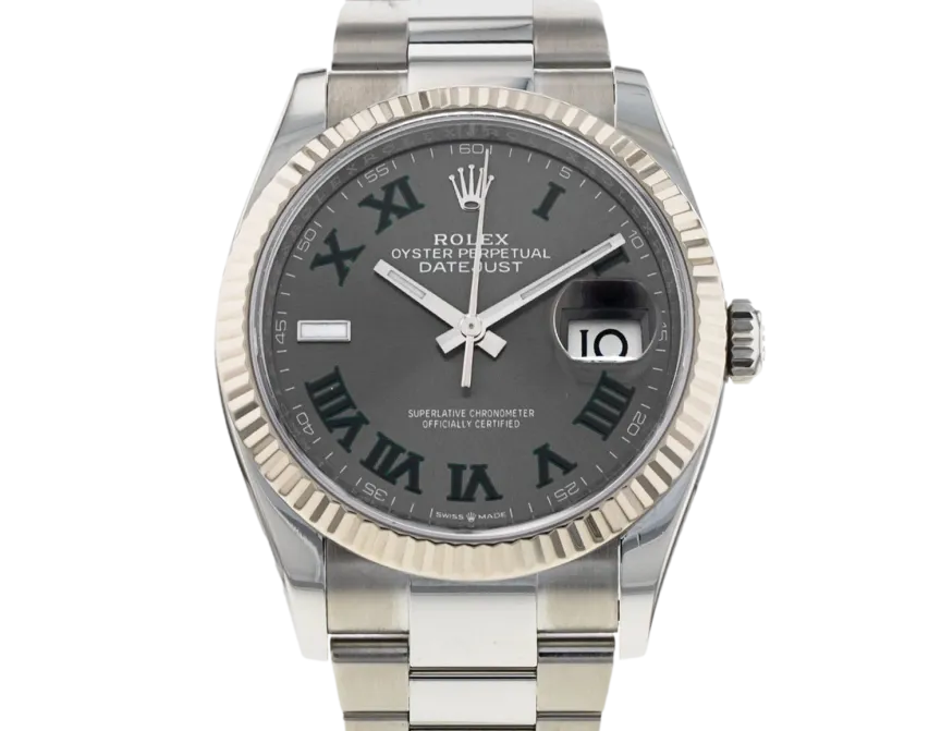 Rolex Datejust 126234 Movement : Automatic Case size : 36mm Case material : Steel & White Gold Bracelet material : Steel (Oyster) Dial type : Slate Roman Numeral Water resistance : 100 Metres