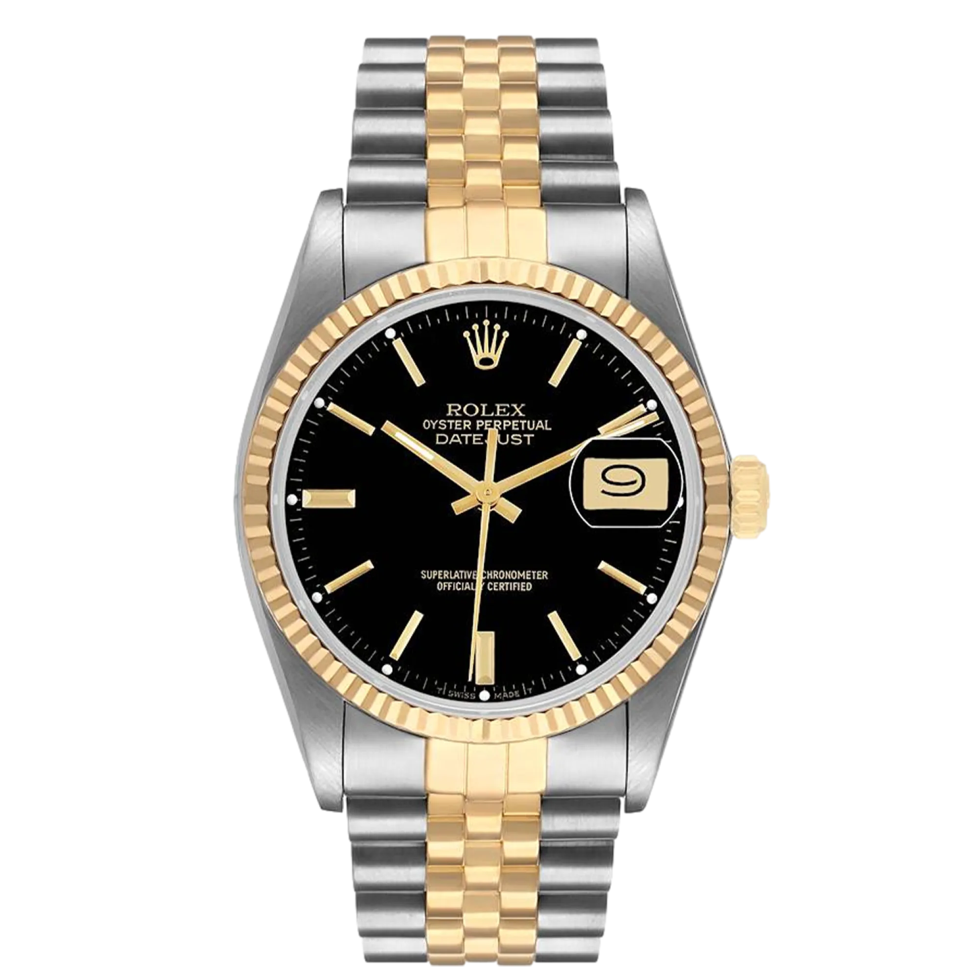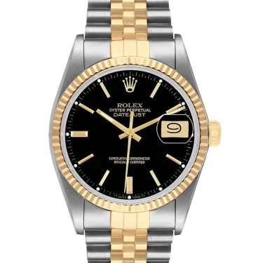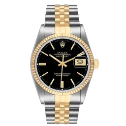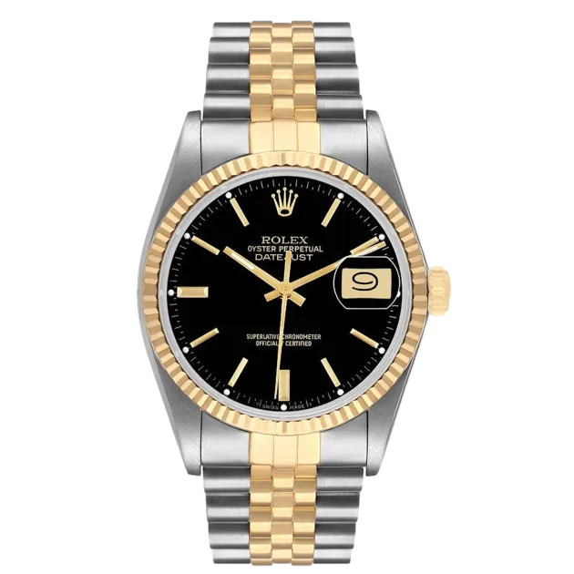 Rolex Datejust 16013 36 mm, Stainless steel/Gold case and Jubilee strap, Yellow Gold bezel, Fold clasp, Black dial, Automatic movement, Movement/Caliber 3035, 10 ATM water resistance with original box, original papers and is in perfect working conditions. This watch has been checked, certified and carried out the water resistance test and has 2-year warranty from the date of purchase.