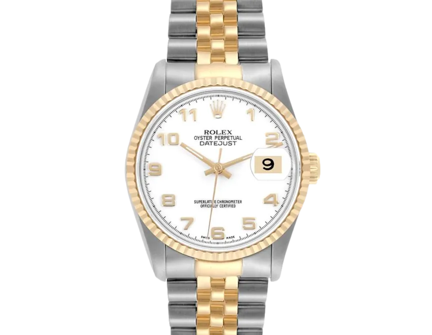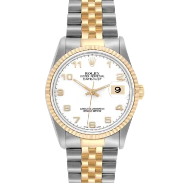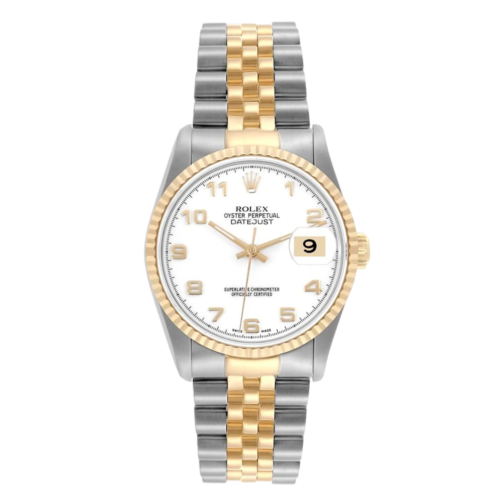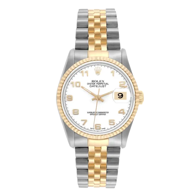 Rolex Datejust 16233 36 mm, Gold/Stainless steel case and Jubilee strap, Yellow gold bezel, Fold clasp, White dial, Automatic movement, Movement/Caliber 3135, 10 ATM water resistance with original box, original papers and is in perfect working conditions. This watch has been checked, certified and carried out the water resistance test and has 2-year warranty from the date of purchase.