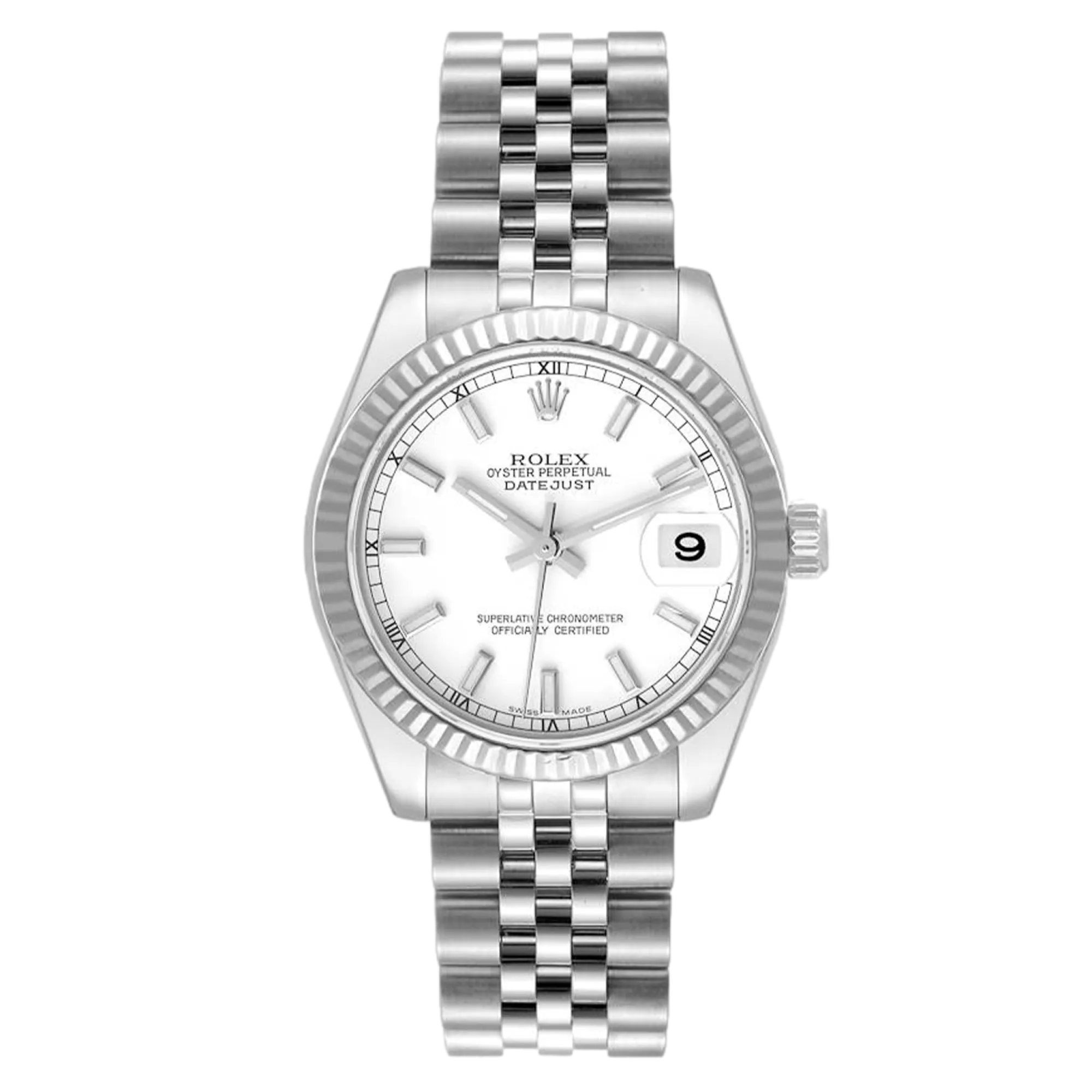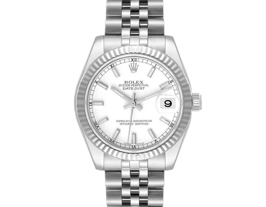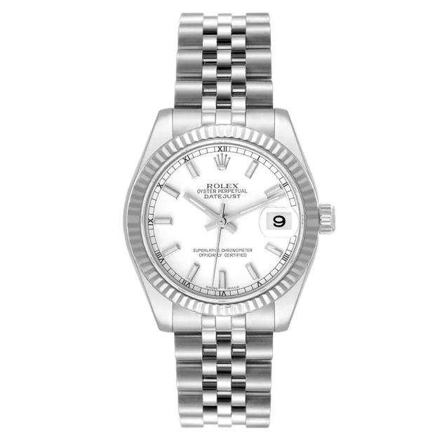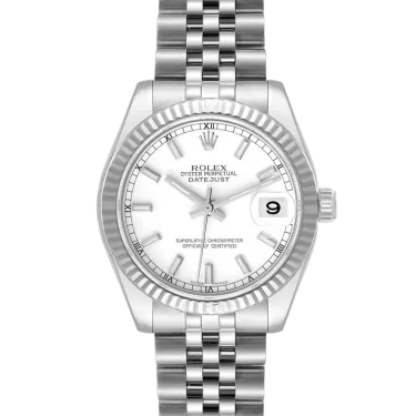 Rolex Datejust Lady 31 178274 Movement : Automatic Case size : 31mm Case material : Steel & White Gold Bracelet material : Steel (Jubilee) Dial type : White Baton Water resistance : 100 Metres
