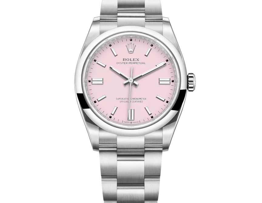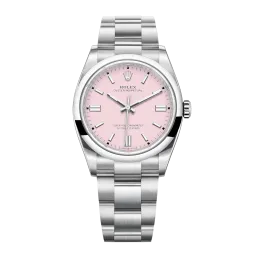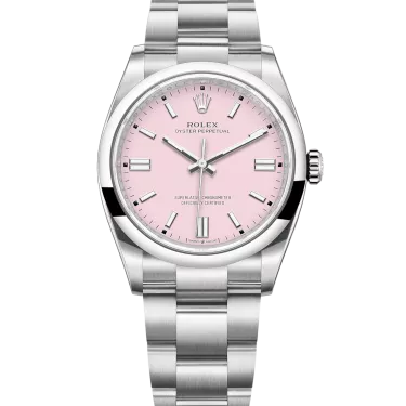 Rolex Oyster Perpetual 126000 Movement : Automatic Case size : 36mm Case material : Steel Bracelet material : Steel (Oyster) Dial type : Candy Pink Water resistance : 100 Metres