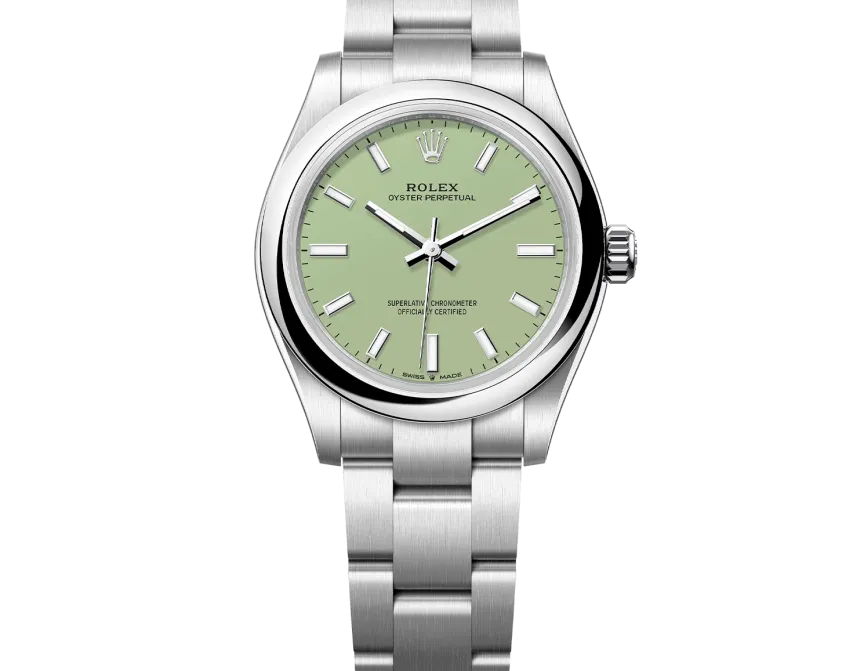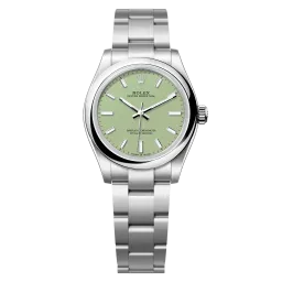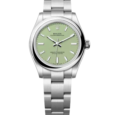 The Oyster Perpetual 31 277200 with a Pistachio dial and an Oyster bracelet. The aesthetics of the Oyster Perpetual models set them apart as symbols of universal and classic style. They embody timeless form and function, firmly rooted in the pioneering origins of Rolex. Stainless steel case, bezel and oyster strap, Fold clasp, automatic movement, Movement/Caliber 2232, 10 ATM water resistance.