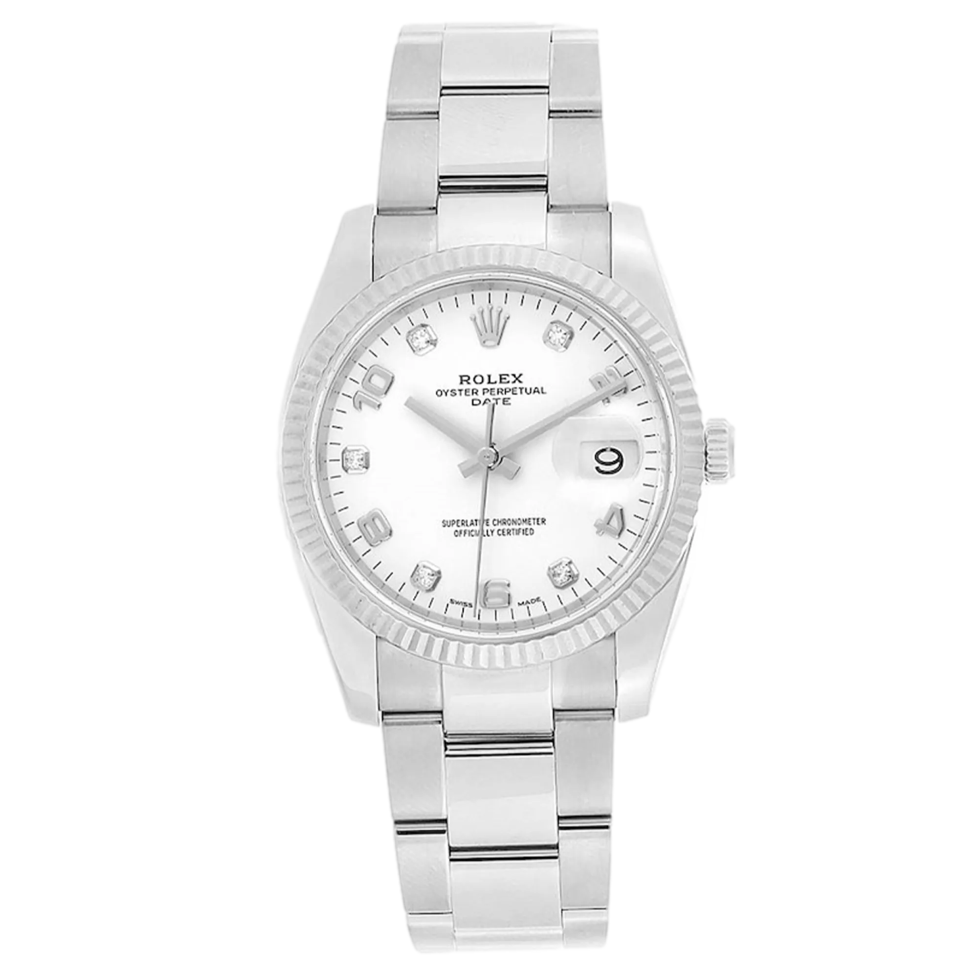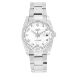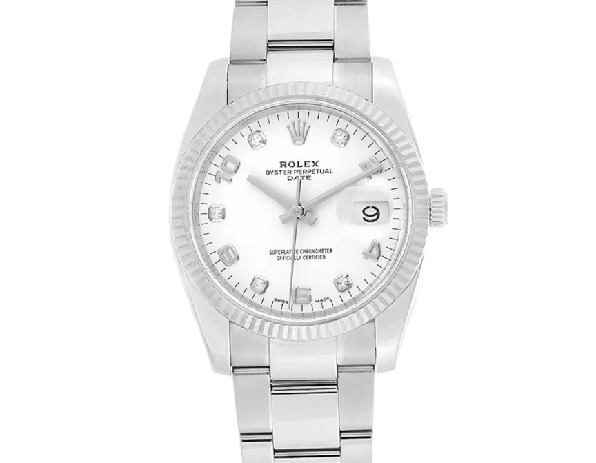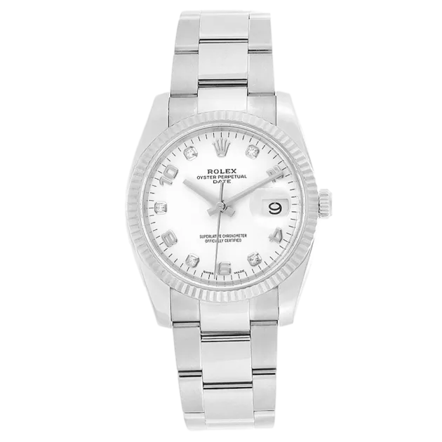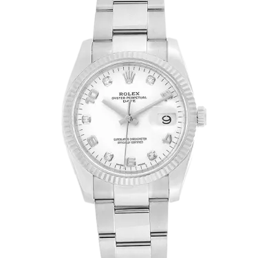 Rolex Oyster Perpetual Date 115234 Movement : Automatic Case size : 34mm Case material : Steel & White Gold Bracelet material : Steel (Oyster) Dial type : White Diamond Water resistance : 100 Metres