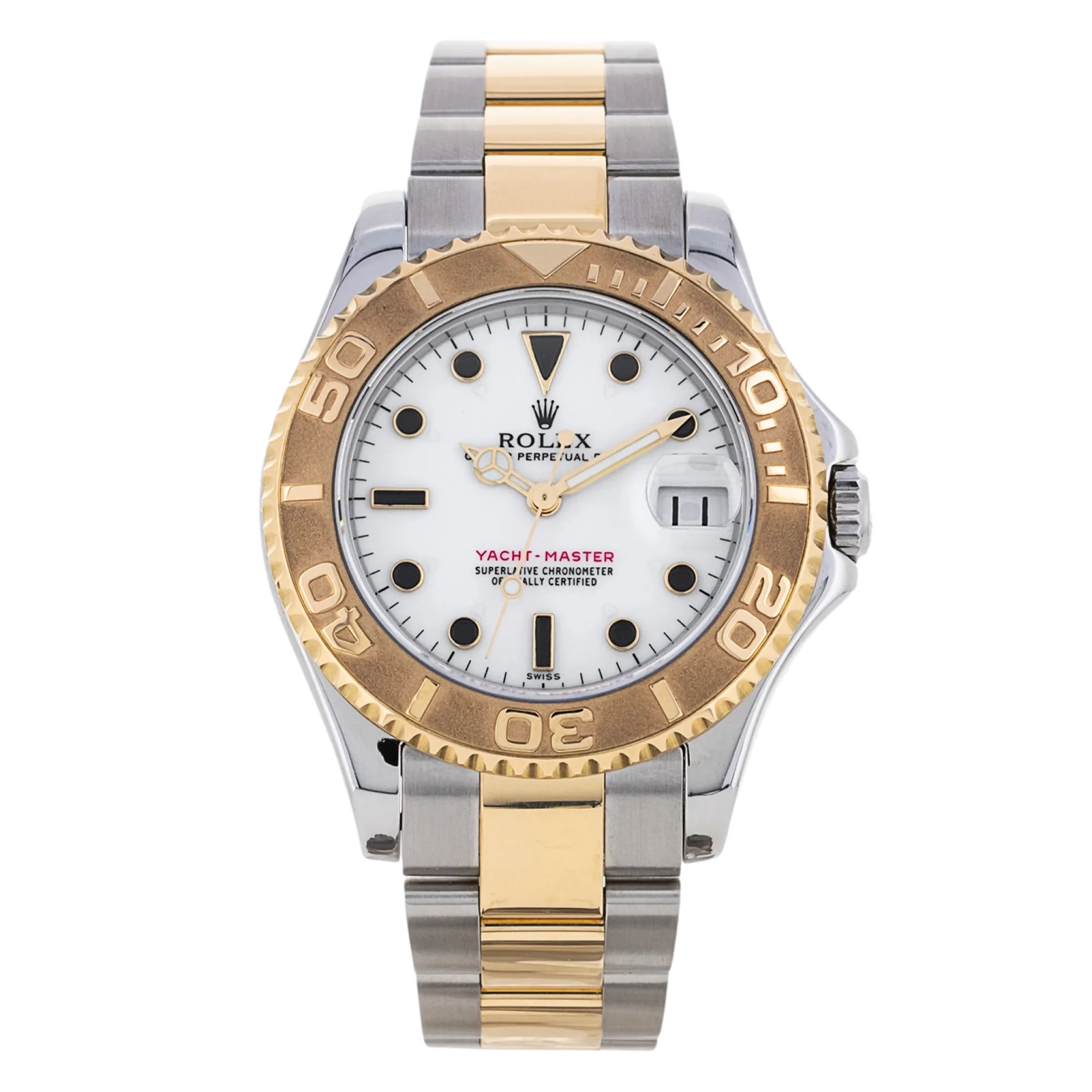 Rolex Yacht-Master 68623 35 mm, Gold/Stainless steel case and oyster strap, Yellow gold bezel, Fold clasp, White dial, Automatic movement with original box, original papers and is in perfect working conditions. This watch has been checked, certified and carried out the water resistance test and has 2-year warranty from the date of purchase.