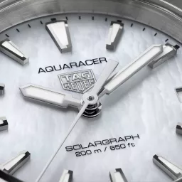 Go further than ever with this TAG Heuer Aquaracer. Its mother-of-pearl sunray brushed dial, enhanced with white Super-LumiNova®, ensures maximal legibility in all conditions. Water-resistant to 200 meters and powered by the batteryless, sun-fuelled Solargraph Calibre TH50-01 which offers up to 10 months of autonomy, it’s a versatile choice for the modern explorer.