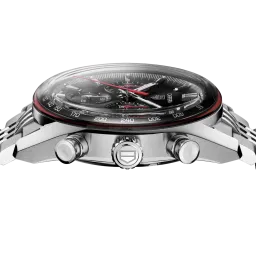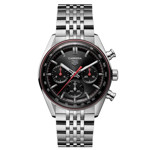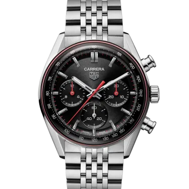 Dynamic and daring, this 41mm TAG Heuer Carrera Chronograph channels the Maison’s racing DNA through a striking black dial with a subtle red outer ring. A bold interpretation of precision and contrast, it brings timeless motorsport heritage into sharp modern focus, driven by the in-house Calibre TH20-01 with 80-hour power reserve.