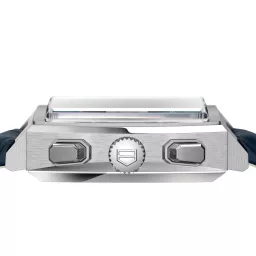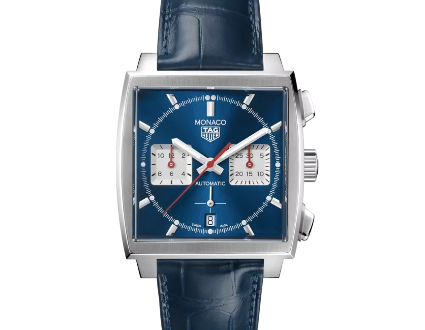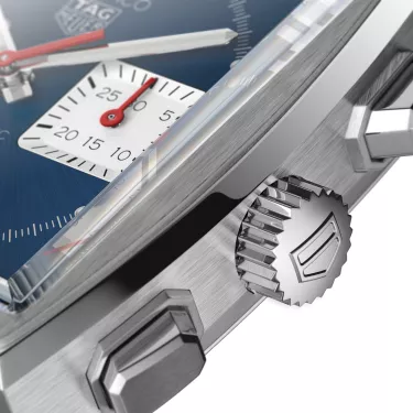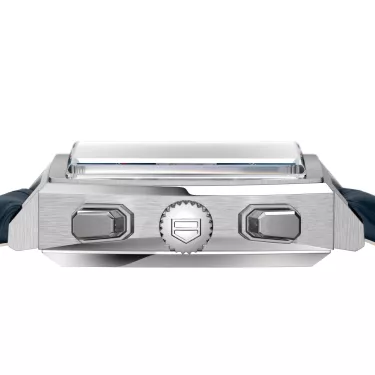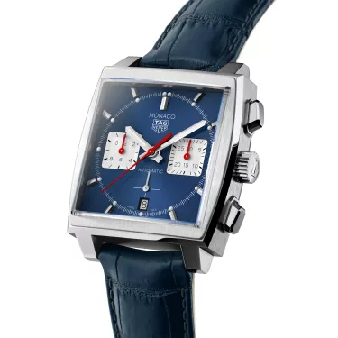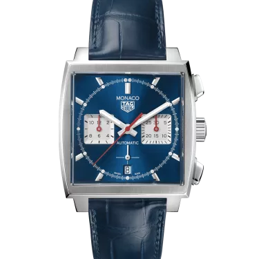 A rebel classic in the watch world, the bold, square Monaco is instantly recognisable. The 39mm steel case is fine-brushed and polished while the perforated blue alligator strap signals rugged luxury. The glimmering blue metallic dial, silver-toned indexes and minute and hour hands, and racy red central and sub-dial hands are as fearlessly sexy as the Steve McQueen original.