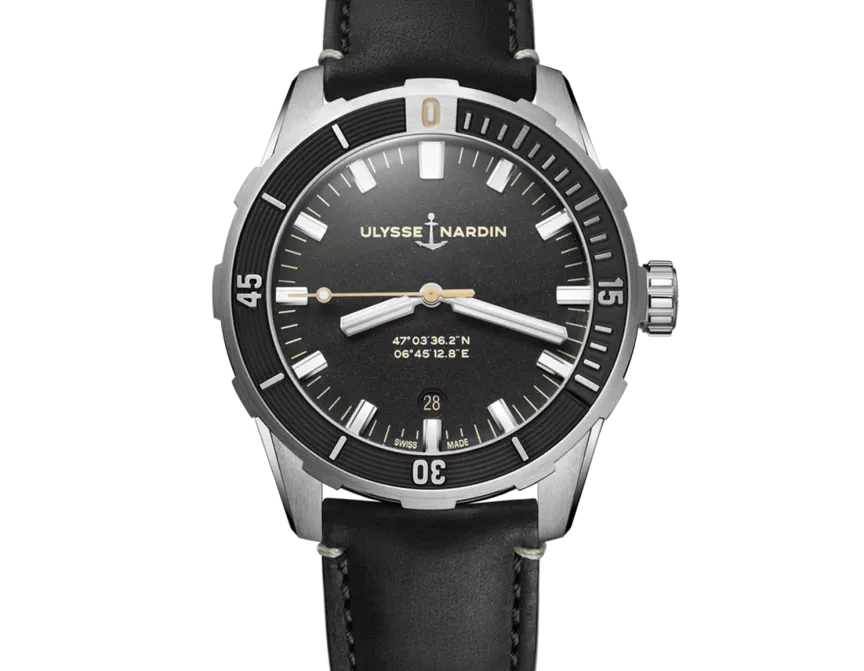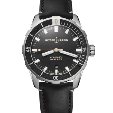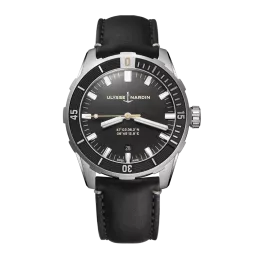 Diver; Cal. 11½" UN-816. 21 jewels. Self-winding movement; Stainless steel case, 42mm, Water-resistant : 300 m; Black dial and Calf Leather strap.