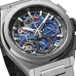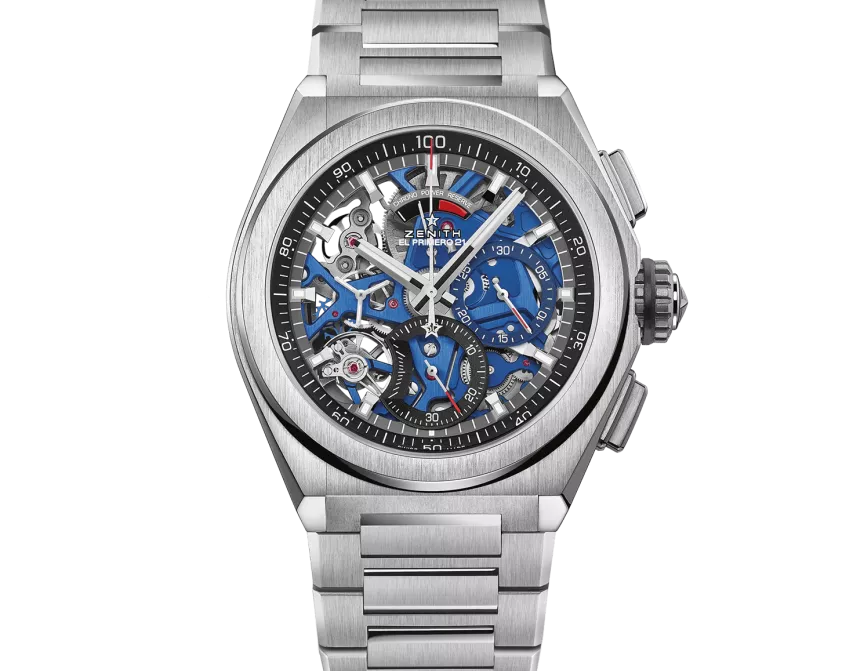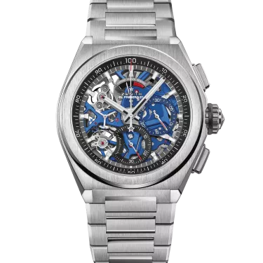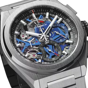 1/100th of a second Chronograph movement Exclusive dynamic signature of one rotation per second for the Chrono hand 1 escapement for the Watch (36,000 VpH - 5 Hz) ; 1 escapement for the Chronograph (360,000 VpH - 50Hz) Certified Chronometer. A striking blue movement and open dial in the DEFY 21 1/100th of a second chronograph in a 44mm titanium case with integrated titanium bracelet. A high-frequency revolution. The El Primero 21 is the culmination of over 50 years of perfecting the automatic chronograph at the Zenith manufacture. Equipped with two regulating organs and escapements, one beating at 5Hz for timekeeping, and the other at an incredible 50Hz to offer a true 1/100th of a second chronograph display, the El Primero 21 is the chronograph calibre of the 21st century.