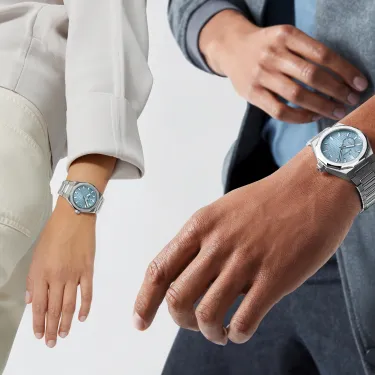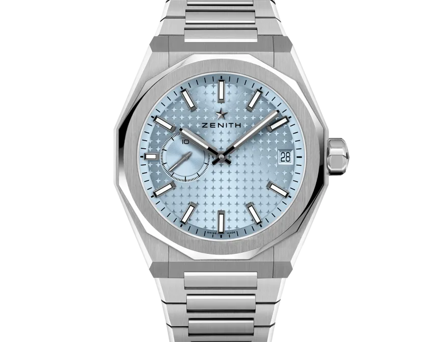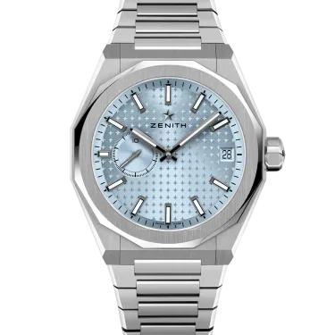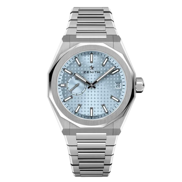 DEFY Skyline watch featuring a 41 mm octagonal steel case enhanced by a faceted bezel, with a polar blue dial with a sunray pattern revisiting the emblematic four-pointed star of ZENITH. Powered by the El Primero 3620 high-frequency automatic manufacture movement with the very first 1/10th of a second indicator. Interchangeable steel bracelet and polar blue patterned rubber strap.