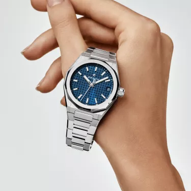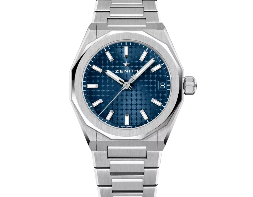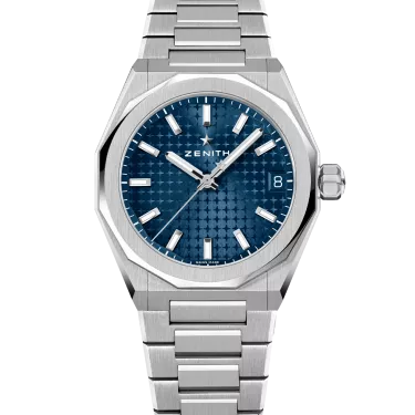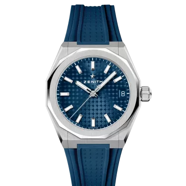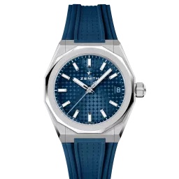 The DEFY Skyline watch features a 36 mm octagonal steel case with a facetted bezel and a blue dial with a sunray pattern revisiting the emblematic four-pointed star of ZENITH. It is powered by the Manufacture Elite 670 automatic movement. Interchangeable steel bracelet and blue patterned rubber strap.