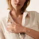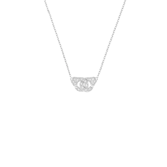 Deux menottes enlacées, un fermoir qui semble presque impossible à démêler. Le motif iconique de la Maison en version pavé se décline sur une chaîne fine. Un bijou symbole d'union, qui incarne l’amour, l’amitié, le lien.