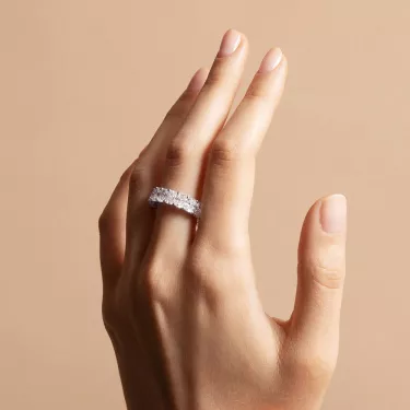 La bague LOEV Diamond Band brille grâce à une bande continue de diamants taille émeraude de 0,30 ct, sertis à l'emporte-pièce. La bague fait sensation lorsqu'elle est portée seule ou combinée et empilée avec une silhouette solitaire. La collection de fiançailles LOEV est composée de diamants cultivés en laboratoire à l'aide d'énergie renouvelable.