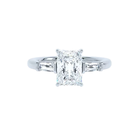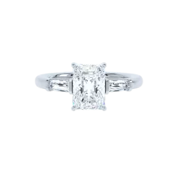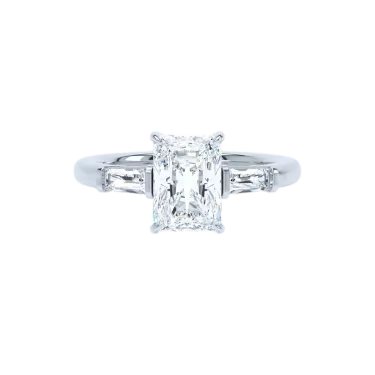 Une combinaison chic et intemporelle : la bague LOEV à trois pierres. Un diamant radiant au centre, flanqué de diamants baguettes effilés. La bague est sertie d'un diamant radiant de 2,03 ct et de baguettes d'un poids total de 0,34 ct en or recyclé 18Kt. La collection de fiançailles LOEV est composée de diamants cultivés en laboratoire à l'aide d'énergie renouvelable.
