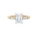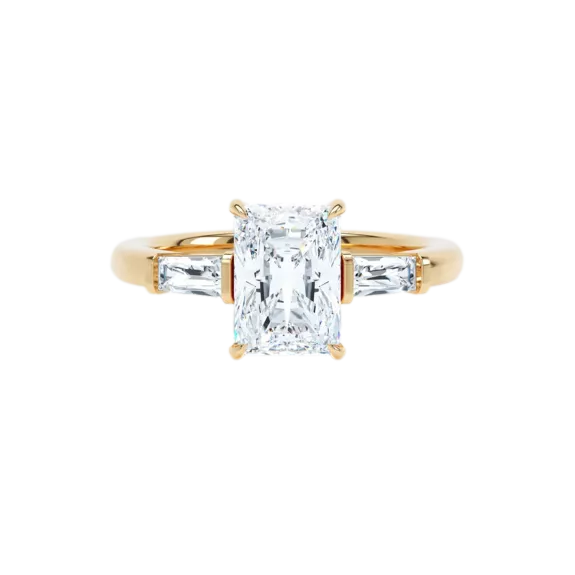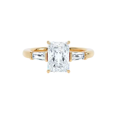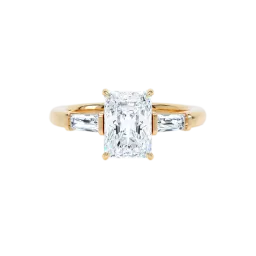 Une combinaison chic et intemporelle : la bague LOEV à trois pierres. Un diamant radiant au centre, flanqué de diamants baguettes effilés. La bague est sertie d'un diamant radiant de 2,03 ct et de baguettes d'un poids total de 0,34 ct en or recyclé 18Kt. La collection de fiançailles LOEV est composée de diamants cultivés en laboratoire à l'aide d'énergie renouvelable.