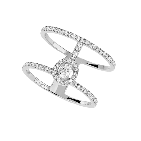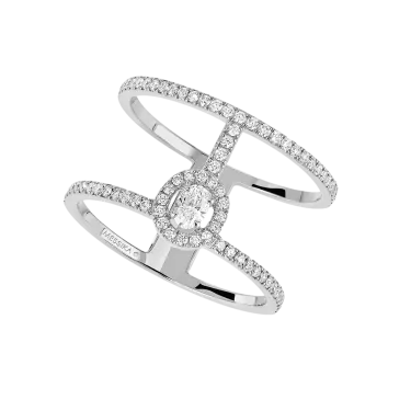 Hypnotiques. Les bagues Glam'Azone jouent sur les contrastes. Structure ajourée en or blanc 18 carats pour un bijou à fleur de peau. Diamant de centre taille ovale magnifié par un entourage serti de diamants. Dans sa version deux rangs pavée, la bague Glam'Azone joue à la fois sur l'intemporalité et l'audace. Un bijou sensuel et éclatant, qui se distingue par un travail de serti unique réalisé à la main par les maîtres artisans Messika. Dans la ligne de ces neo-bijoux si tendance, cette bague séduira la femme contemporaine en quête d'originalité et de lumière. La brillance de l'or blanc vient renforcer la pureté des diamants, accentuant ainsi leur magnifique éclat.