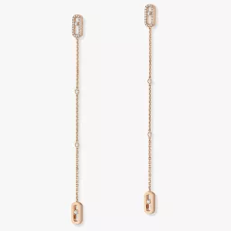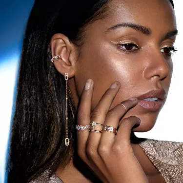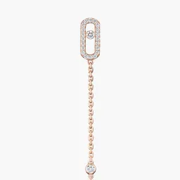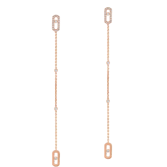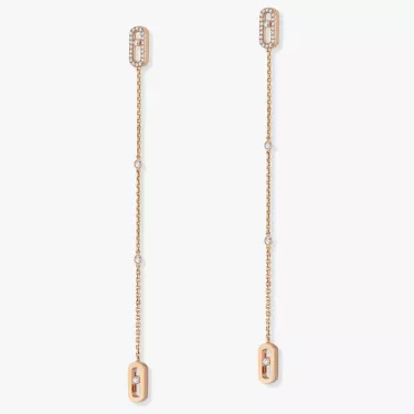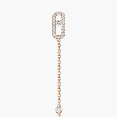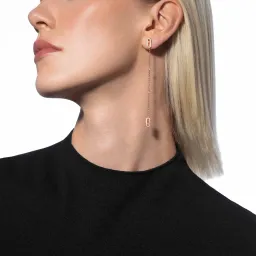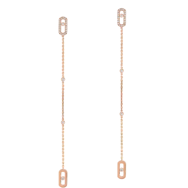 Donnez à votre visage tout l'éclat et la luminosité qu'il mérite, avec les nouvelles boucles d'oreilles pendantes diamant de la collection de Joaillerie Move Uno. Un bijou diamant femme graphique, contemporain, où diamants et or rose cohabitent à merveille. Une délicate chaîne relie entre eux les motifs iconiques Move. Celui du bas s'anime au gré des mouvements de celle qui le porte. Jeux de lumières, jeux de mouvements pour une joaillerie du quotidien. Une longueur osée et revendiquée pour une sensualité éprouvée.