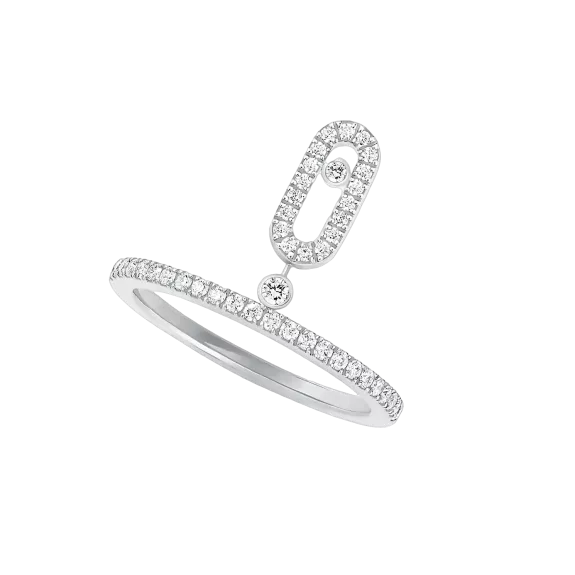 Vous cherchez une bague à la fois élégante et originale ? Union d'une alliance diamantée et d'une bague bohème chic, la bague diamantée Move Uno illumine votre main. Le motif signature de Messika se décline en charms pour transformer une alliance sertie de diamants étincelants. Lancé à l'origine en exclusivité pour les Emirats Arabes Unis, ce modèle a connu un tel succès qu'il n'a pu être proposé à toutes les autres admiratrices de la Maison. Il peut être porté seul ou avec d'autres créations Messika, selon la tendance du stacking chère à Valérie Messika.