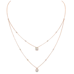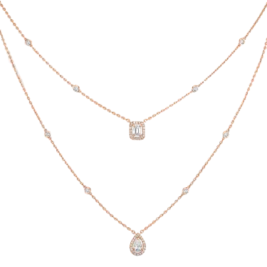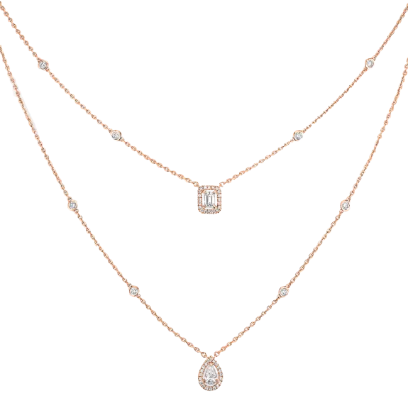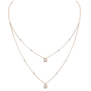 La collection My Twin célèbre le diamant dans toutes ses formes, dans toutes ses tailles et en particulier le rapport de jeu de lumière entre la taille poire et la taille émeraude. Valérie Messika s’est en particulier intéressée à l’apparente opposition entre l’esprit architecturée de la taille émeraude et le galbe de la taille poire. Ce collier My Twin 2 rangs en or rose 18 carats réinterprète la tendance actuelle de l'accumulation de deux colliers. Une création moderne sur deux chaînes de deux longueurs différentes où se répondent diamant taille poire de 0,20ct et diamant taille émeraude de 0,20ct. Avec un large décolleté en V, une chemise ouverte ou un pull à col roulé, ce collier diamant habille joliment le cou et sublime le décolleté tout en délicatesse. L'or rose 18 carats développé par Messika est particulièrement doux et discret. Il confère ainsi à ce collier diamant un luxe discret, non ostentatoire.