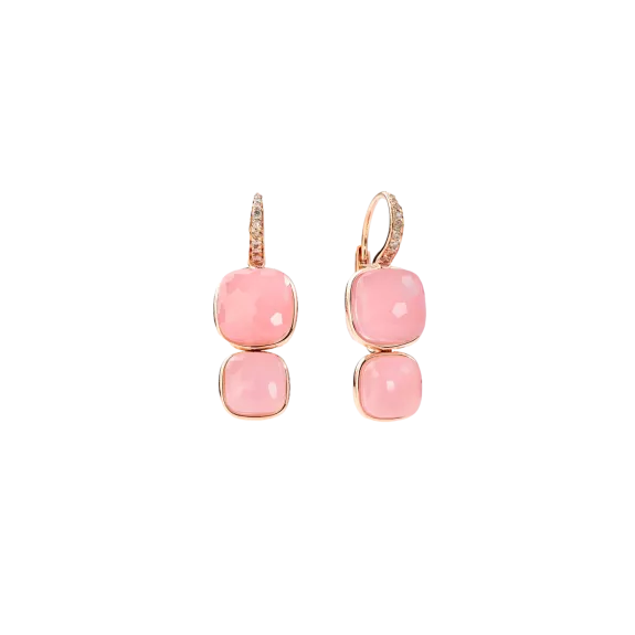 Nudo dévoile pour la première fois une boucle d’oreille double goutte très glamour en calcédoine rose et quartz rose. Les deux pierres précieuses sont parfaitement serties dos à dos et réunies, au milieu, par une bande en or offrant un double jeu de lumière ainsi que de nouvelles expériences chromatiques grâce à la taille unique de Clessidra signée Pomellato. Pour une finition étincelante du bijou, les diamants cognac sont sertis dans une rondelle au-dessus des pierres précieuses.