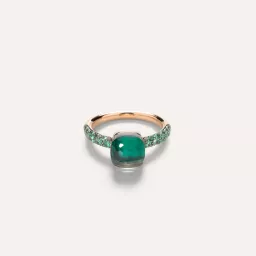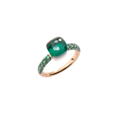 Se distinguant par ses couleurs intenses, Nudo reste la création phare de Pomellato. Immédiatement reconnaissable, la nouvelle bague Nudo décline un tout nouveau duo : prasiolite et malachite accompagnées d’un pavé de tsavorites.