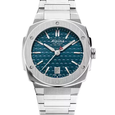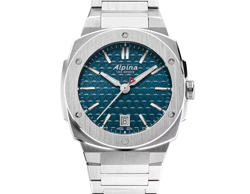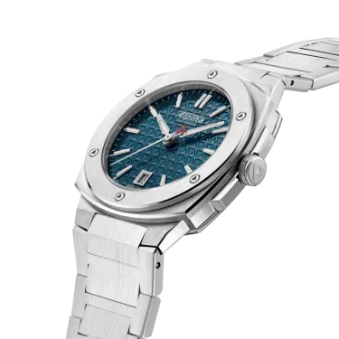 Boîtier en acier inoxydable brossé et poli en trois parties, diamètre de 34X35,20 mm, hauteur de 8,35 mm, verre saphir antireflet, étanche jusqu'à 10 ATM/100m/330ft. Calibre AL-220, quartz, 45 mois, 1 bijou. Cadran bleu avec motif triangulaire, marqueurs blancs, index argentés appliqués remplis d'un traitement lumineux blanc, guichet date à 6 heures, aiguilles des heures et des minutes argentées polies à la main remplies d'un traitement lumineux blanc, trotteuse argentée polie avec triangle rouge, bracelet en acier inoxydable brossé et poli, boucle déployante avec bouton-poussoir.