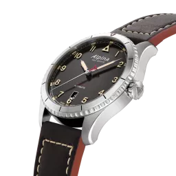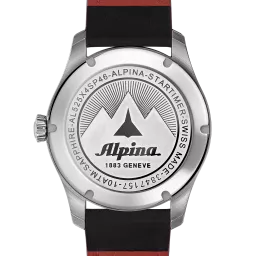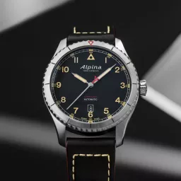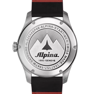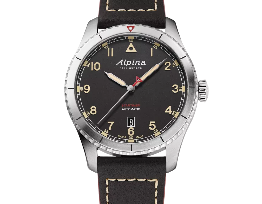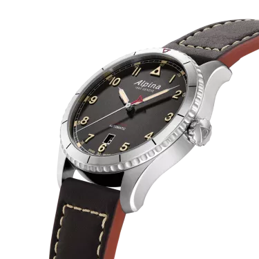 Alpina Startimer Pilot 41 mm avec fonctions Heures, minutes, secondes, date ; Calibre Al-525, mouvement automatique, réserve de marche de 38 heures, 26 rubis, 28'800 alt/h ; Boîtier en 2 parties en acier inoxydable brossé et poli, Diamètre de 41 mm, Hauteur de 11,50 mm, Verre saphir convexe inrayable avec traitement anti-reflet, Etanche jusqu'à 10atm/100m/330ft, Couronne vissée & Fond gravé ; Cadran noir avec finition mate et index beige appliqués avec traitement lumineux, Anneau extérieur avec graduation beige des secondes, Guichet date à 6 heures, Aiguilles des heures et des minutes couleur argent polies à la main remplies avec traitement lumineux beige, Aiguille des secondes couleur argent polie à la main avec triangle rouge et Bracelet en cuir de veau noir avec surpiqûres blanc cassé et doublure rouge.