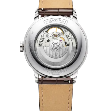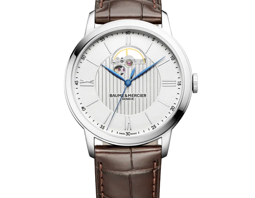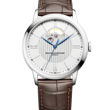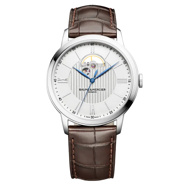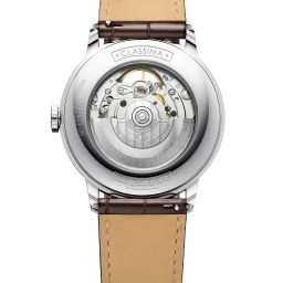 Alliant des chiffres romains classiques, un luxueux bracelet en alligator marron foncé et un balancier visible sur le cadran, cette montre s’adresse aux goûts uniques. Elle se compose d’un boîtier en acier inoxydable, d'index en plaqué rhodium et d’aiguilles en forme de feuilles en acier bleui.