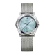 Montre femme EBEL 1911, boîte en acier inoxydable, Ø 34mm, cadran galvanique bleu pastel et chiffres arabes, guichet date à 6h00, glace saphir antireflet dessous, bracelet en acier inoxydable, boucle déployante, livrée avec un bracelet en tissu (fabriqué à partir de plastique recyclé provenant de l'océan) et doublure en liège, mouvement quartz suisse, étanche jusqu'à 10 bar.