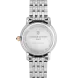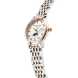 Boîtier en acier inoxydable et bracelet en acier inoxydable à deux tons (argenté et plaqué or rose). Cadran en nacre blanc avec aiguilles dorées et index en diamants. Index aux positions 3, 6, 9 et 12 heures. Type de cadran: analogique. Affichage de phase de lune. Mouvement à quartz Frédérique Constant FC-206.