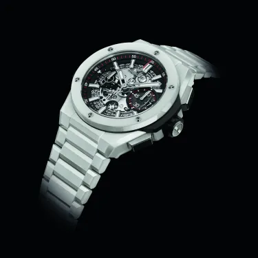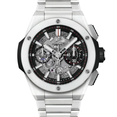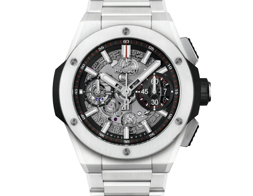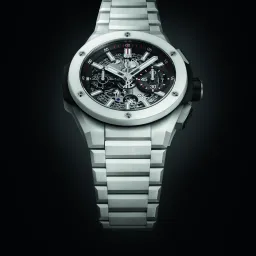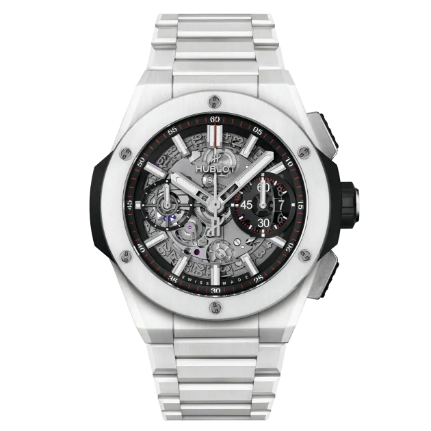 Hublot Big Bang Integrated White Ceramic référence 451.HX.1123. HX, HUB1280 UNICO Manufacture Mouvement chronographe à remontage automatique avec roue à colonnes, boîtier en céramique blanche polie et satinée de 42 mm, lunette en céramique blanche satinée et polie avec 6 vis en titane en forme de H, étanchéité à 100 m ou 10 ATM, verre saphir avec traitement antireflet, cadran squelette blanc mat, bracelet en céramique blanche satinée et polie avec boucle déployante en titane.