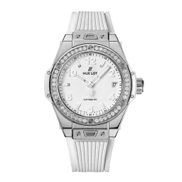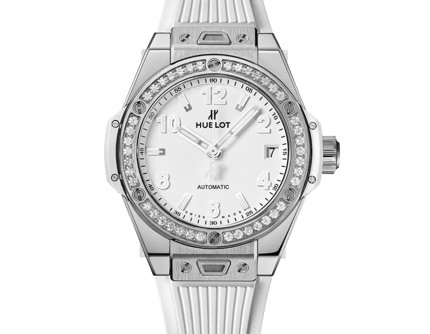 Acier inoxydable poli et satiné, acier inoxydable poli serti de 36 diamants pour une lunette de 0,76ct, étanchéité à 100m ou 10 ATM, verre saphir avec traitement anti-reflet, cadran blanc mat, mouvement à remontage automatique HUB1120, réserve de marche de 40 heures, bracelets en caoutchouc blanc structuré et boucle déployante en acier inoxydable.