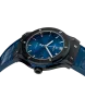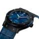 Boîtier en céramique noire polie avec maillons centraux finis brossés entre les cornes. Lunette en céramique noire avec une finition brossée et des bords finis, sécurisée avec 6 vis en titane "H" polies. Couronne en céramique noire polie avec insert en caoutchouc. Résine composite bleue. Cadran bleu avec une belle finition sunray. Index de style "applique" en acier inoxydable brossé. Aiguilles polies au rhodium. Le calibre Hublot HUB1110, composé de 63 pièces, contient 21 bijoux et possède une réserve de marche d'environ 42 heures.