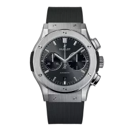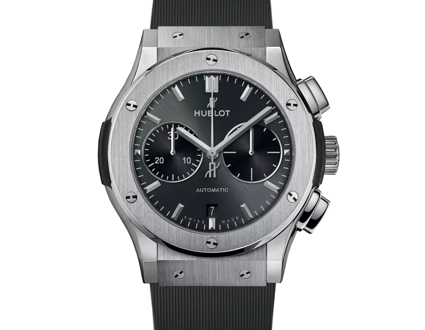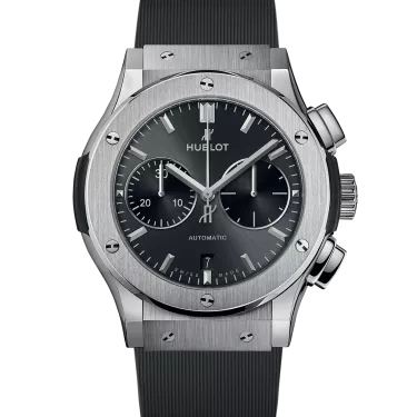 Hublot Classic Fusion Racing Grey Titanium, boîtier en titane satiné et poli, lunette en titane satiné et poli avec 6 vis en titane en forme de H, étanchéité à 50 m ou 5 ATM, verre saphir avec traitement anti-reflets, cadran gris soleil satiné, mouvement chronographe à remontage automatique HUB1143, réserve de marche de 42 heures, bracelets en caoutchouc ligné gris et boucle déployante en acier fin.