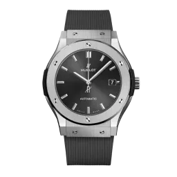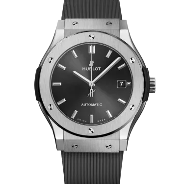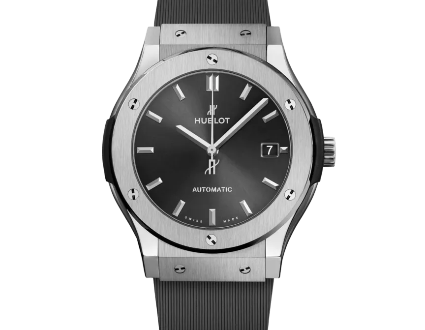 Hublot Classic Fusion Racing Grey Titanium, boîtier en titane satiné et poli, lunette en titane satiné et poli avec 6 vis en titane en forme de H, étanchéité à 50 m ou 5 ATM, verre saphir avec traitement anti-reflets, cadran gris soleil satiné, mouvement automatique HUB1110, réserve de marche de 42 heures, bracelets en caoutchouc ligné gris et boucle déployante en acier fin.