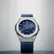 Hublot Classic Fusion Titanium Blue 45 mm, boîtier en titane satiné et poli, lunette en titane satiné et poli avec 6 vis en titane en forme de H, étanchéité à 50 m ou 5 ATM, verre saphir avec traitement anti-reflets, cadran satiné bleu soleil, mouvement à remontage automatique HUB1112, réserve de marche de 42 heures, bracelets en caoutchouc bleu ligné et boucle déployante en acier fin.