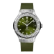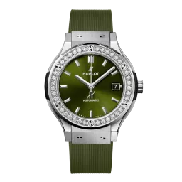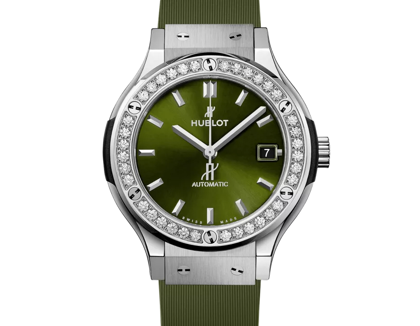 Hublot Classic Fusion Titanium Green Diamonds 38 mm, boîtier en titane satiné et poli, lunette en titane satiné et poli avec 6 vis en titane en forme de H, étanchéité à 50 m ou 5 ATM, Verre saphir avec traitement anti-reflets, cadran satiné vert soleil, mouvement à remontage automatique HUB1110, réserve de marche de 42 heures, Bracelets en caoutchouc vert ligné et Boucle déployante en acier fin.