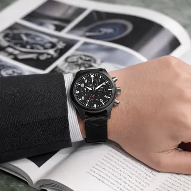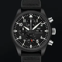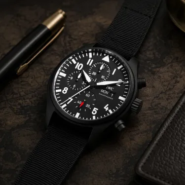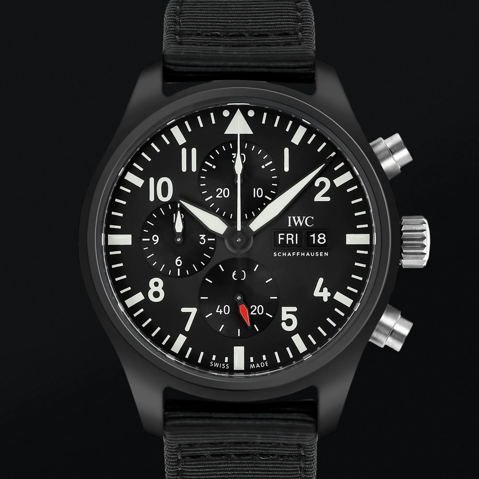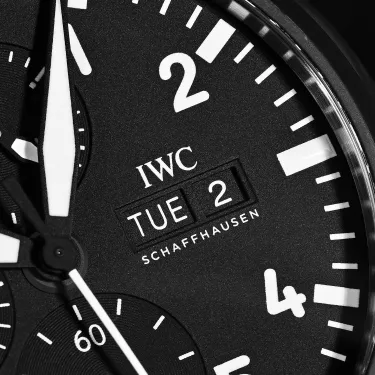 Boîtier en céramique noire avec un bracelet en textile NATO noir. Lunette fixe en céramique noire. Cadran noir avec aiguilles noires lumineuses et index en chiffres arabes. Index des minutes sur le pourtour extérieur. Type de cadran : Analogique. Aiguilles et marqueurs luminescents. Affichage du jour de la semaine et de la date à la position 3 heures. Chronographe - trois sous-cadrans affichant : 60 secondes, 30 minutes et 12 heures. Mouvement automatique IWC Calibre 69380, basé sur le WC 69370, contenant 33 rubis, battant à 28800 vph, et ayant une réserve de marche d'environ 48 heures. Verre saphir résistant aux rayures. Couronne vissée. Fond de boîtier plein. Boîtier de forme ronde, taille du boîtier : 44,5 mm, épaisseur du boîtier : 15,7 mm. Largeur du bracelet : 21 mm. Fermoir à lanière. Étanche à 60 mètres / 200 pieds. Fonctions : chronographe, jour, date, heure, minute, seconde.
