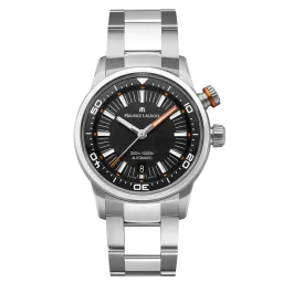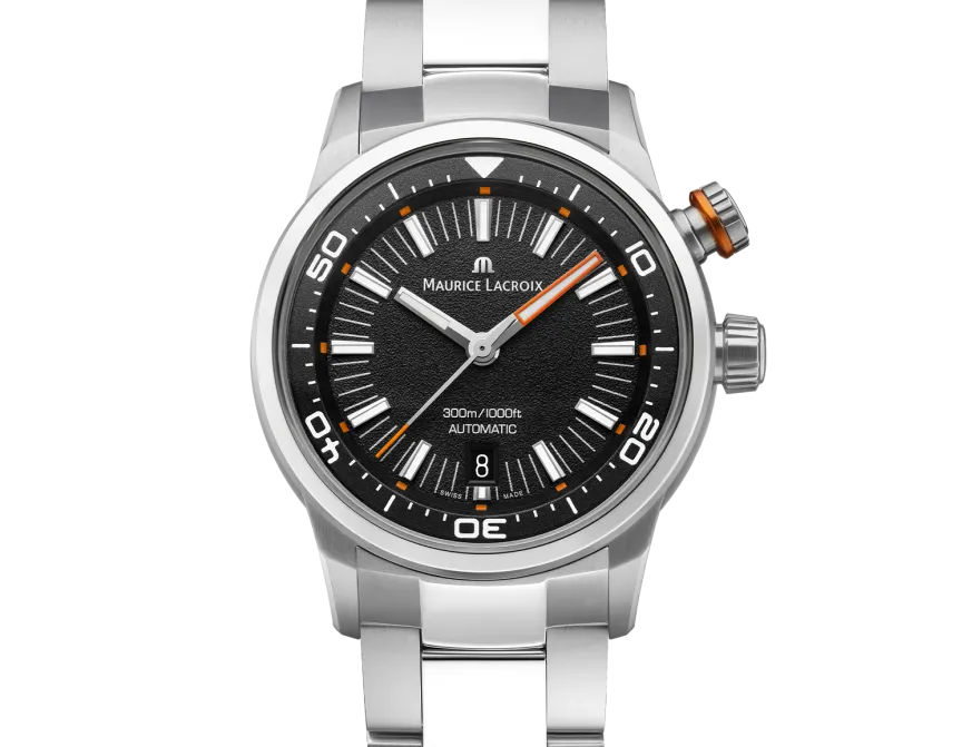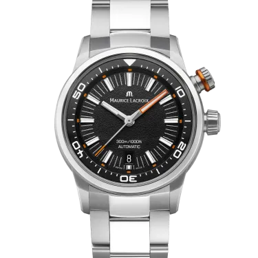 Maurice Lacroix Pontos S Diver 42mm - Boîtier en acier inoxydable brossé et poli de 42mm - Cadran noir, grainé, avec index orange - Verre saphir - ML115 - SW200 Mouvement automatique - Bracelet en acier inoxydable avec boucle déployante Butterfly.