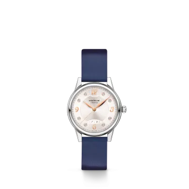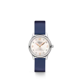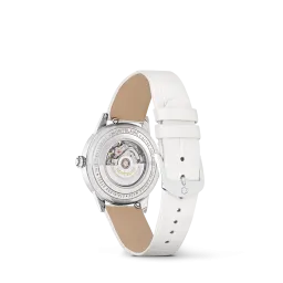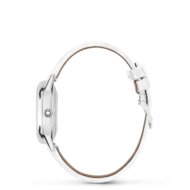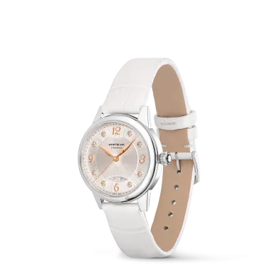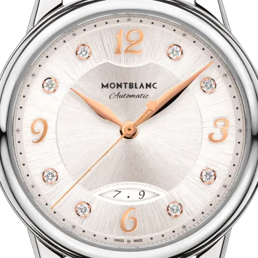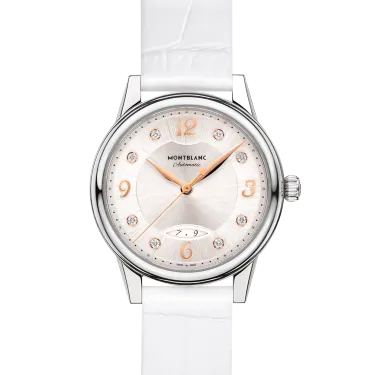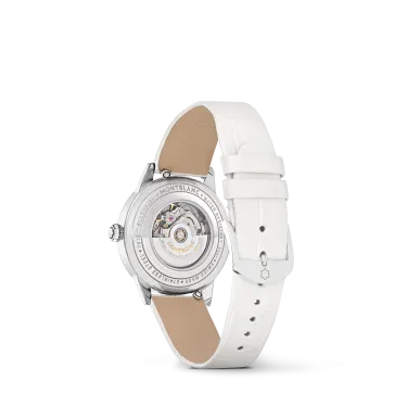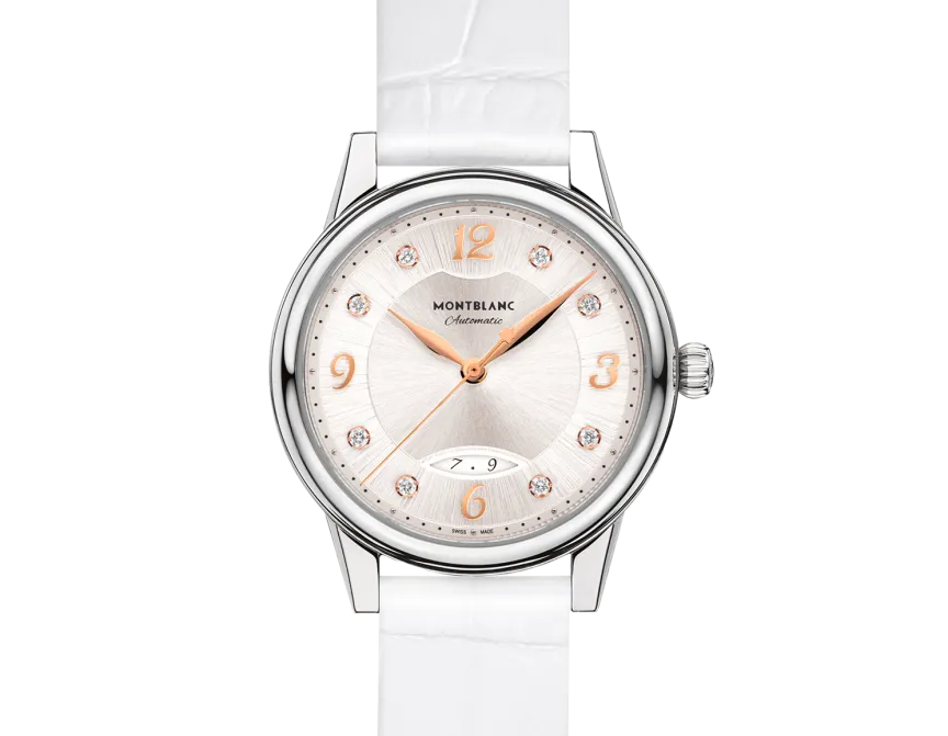 Interprétant les codes de la haute horlogerie avec élégance et féminité, la Montblanc Bohème Day & Night s'inspire de l'univers de l'écriture manuscrite et se présente dans un boîtier en acier inoxydable de 30 mm. Elle est dotée d'un élégant cadran argenté brossé soleil orné d'index en diamants, de chiffres arabes floraux et d'aiguilles plaqués or rose. Parmi les autres détails raffinés, citons un motif filet sauté et une technique d'estampage appelée filé d'étoiles. Équipé du calibre automatique MB 24.29, ce modèle indique les heures, les minutes et les secondes, ainsi que la date affichée dans un guichet en forme d'amande avec des chiffres manuscrits. La police romantique a également été appliquée au cadran pour la mention « Automatic ». Ce garde-temps est équipé d'un bracelet interchangeable en cuir de veau blanc avec imprimé alligator et d'un bracelet supplémentaire.