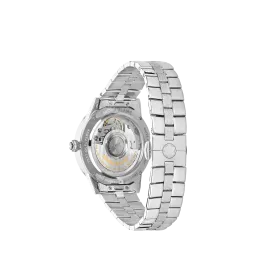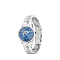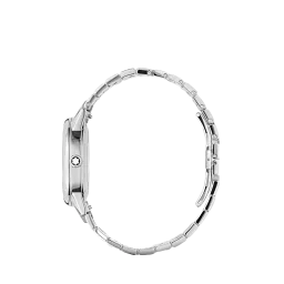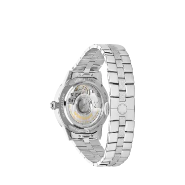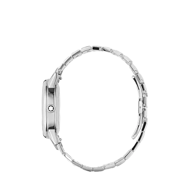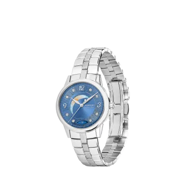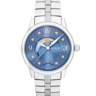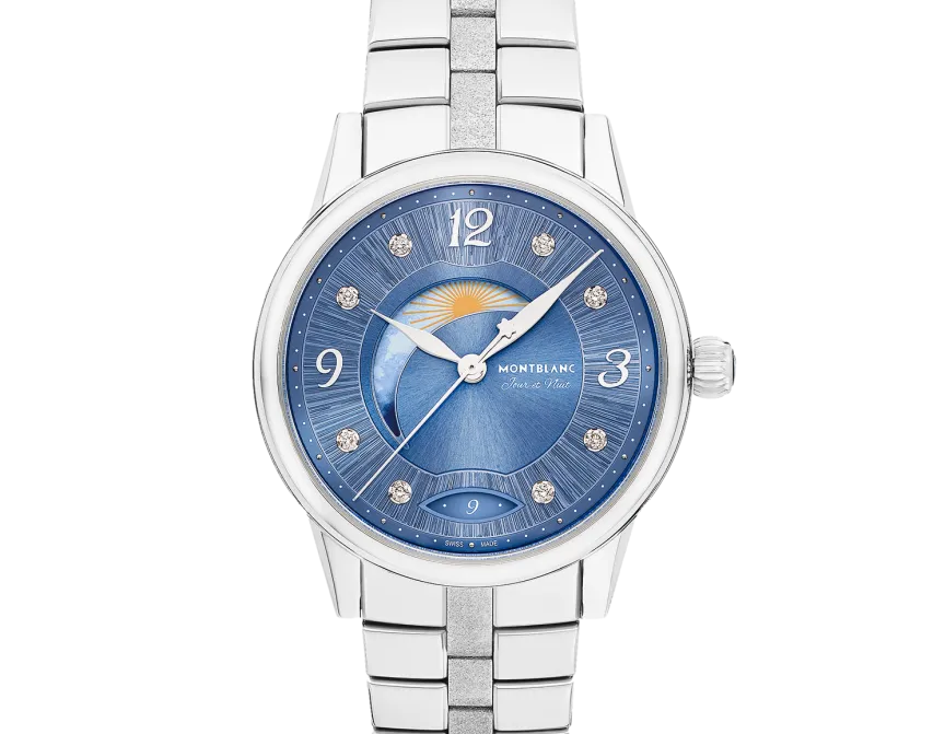 Interprétant les codes de la haute horlogerie avec élégance et féminité, la Montblanc Bohème Day & Night s'inspire de l'écriture manuscrite et de l'aquarelle. Elle se présente dans un boîtier en acier inoxydable de 34 mm. Elle est dotée d'un élégant cadran bleu brossé soleil orné d'index en diamant, de chiffres arabes floraux rhodiés et d'aiguilles. Parmi les autres détails raffinés, citons un motif filet sauté et une technique d'estampage appelée filé d'étoiles. Équipé du calibre automatique MB 24.20, ce modèle indique les heures, les minutes et les secondes, ainsi que la date affichée dans un guichet en forme d'amande avec des chiffres manuscrits. La police romantique a également été appliquée au cadran pour l'indication jour et nuit « Jour et Nuit ». La complication céleste jour et nuit montre l'évolution du ciel sur une période de 24 heures et ajoute une touche romantique et artistique à la montre, car elle est réalisée à l'aquarelle. Cette montre est équipée d'un bracelet interchangeable en acier inoxydable avec un maillon central texturé et un système de réglage fin.