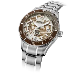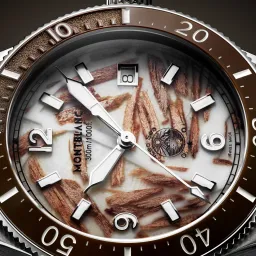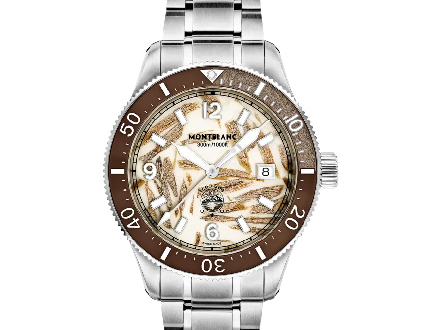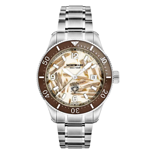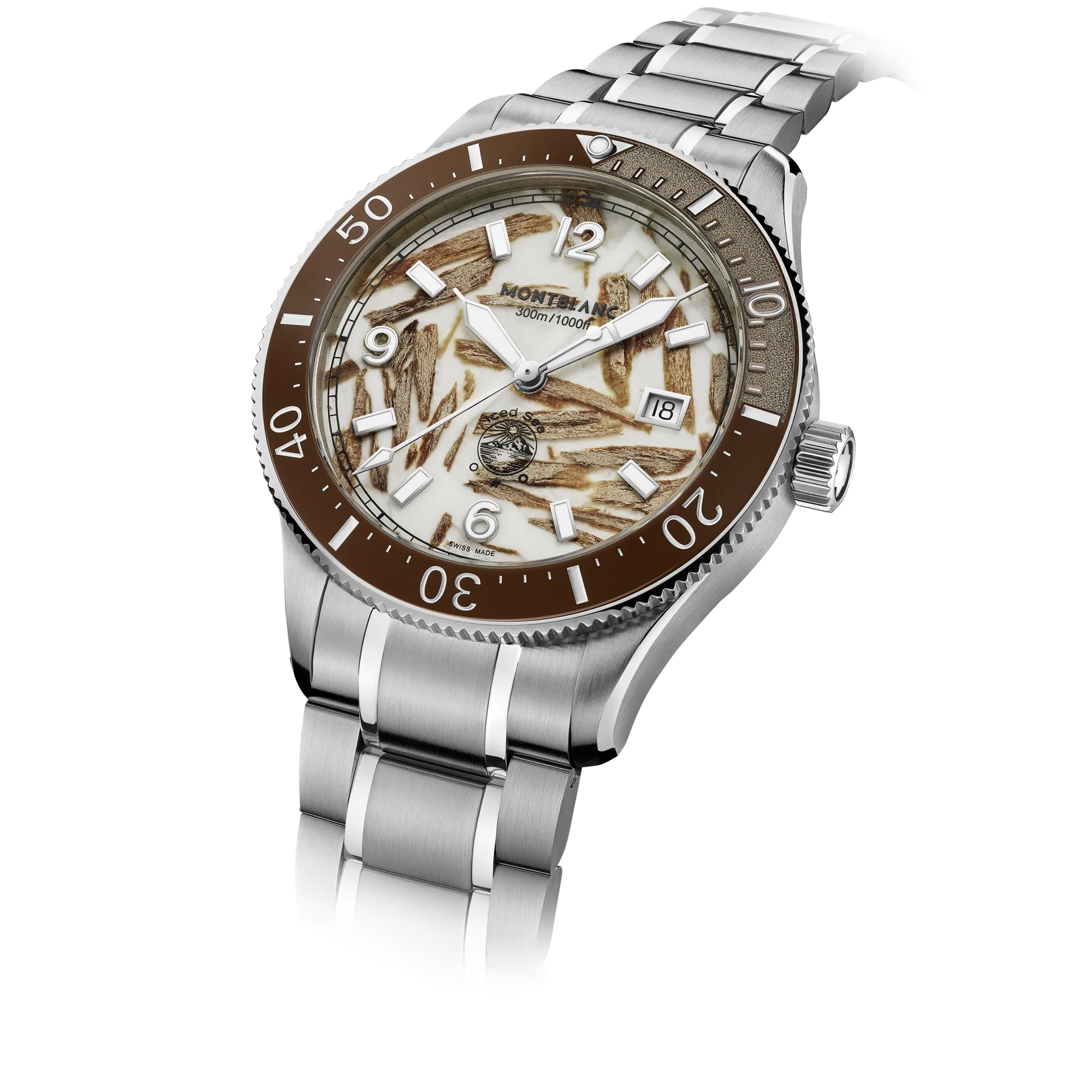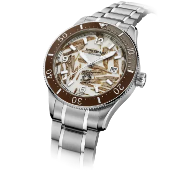 Au fil des siècles, le lent mouvement des glaciers a sculpté certaines des formations géologiques les plus spectaculaires de la Terre. À mesure que les glaciers se forment et reculent, ils mettent à nu et déplacent des sols fertiles. Ce faisant, de nombreux arbres abattus se transforment en subfossiles et sont poussés vers la moraine du glacier, cette masse dense de sédiments que le glacier dépose à sa lisière. La montre Montblanc Iced Sea Automatic Date 0 Oxygen Limited Edition rend hommage à cette formation géologique particulière que l'on retrouve également dans la Mer de Glace, le plus grand glacier du massif du Mont-Blanc. Elle se distingue par un cadran unique et saisissant, incrusté de fragments de bois subfossile provenant de la Mer de Glace ; vieux de plusieurs millénaires, ils ont été préservés après avoir été emprisonnés dans la glace glaciaire. Cette édition limitée à 700 exemplaires est logée dans un boîtier en acier inoxydable de 41 mm totalement dépourvu d’oxygène et est dotée d’une lunette tournante unidirectionnelle avec un insert en céramique brune gravé au laser de 0 à 15 minutes, d’un fond de boîtier estampé et d’un bracelet interchangeable en acier inoxydable avec un système de réglage fin. La montre est étanche jusqu’à 300 mètres.