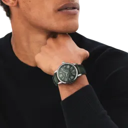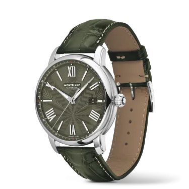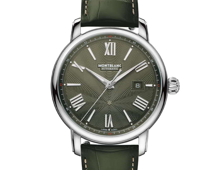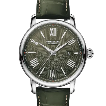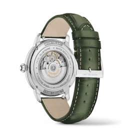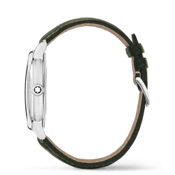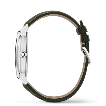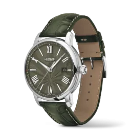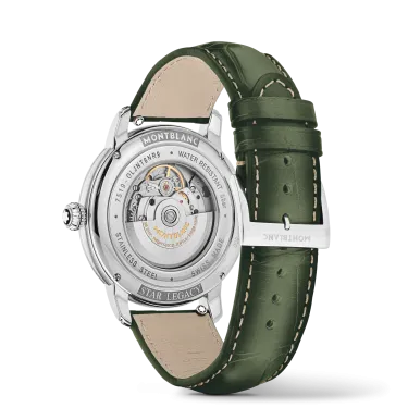 La Montblanc Star Legacy Automatic Date Limited Edition, limitée à 800 exemplaires, est ornée d'un cadran vert arborant le motif étoilé caractéristique de Montblanc, ainsi que d'aiguilles et de chiffres en forme d'épée recouverts de rhodium. Elle est animée par le mouvement automatique MB 24.17 qui indique les heures, les minutes, les secondes et la date. En termes de design, cette montre s'inspire des montres de poche Minerva de la fin du XIXe et du début du XXe siècle, avec leur boîtier rond et poli en forme de galet et leur couronne en forme d'oignon. Elle est également équipée d'un bracelet interchangeable en cuir de veau vert avec imprimé alligator et coutures écrues.