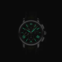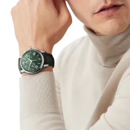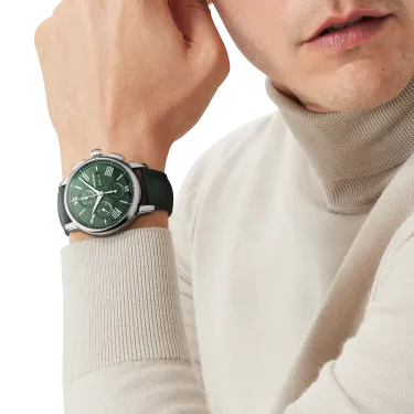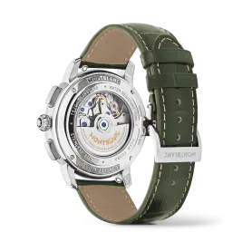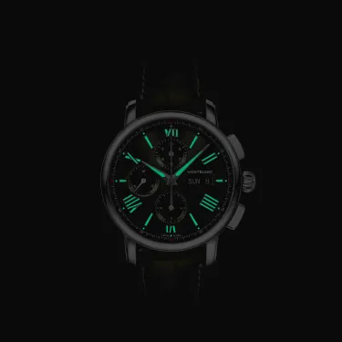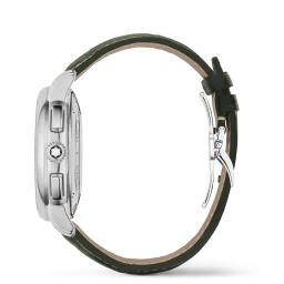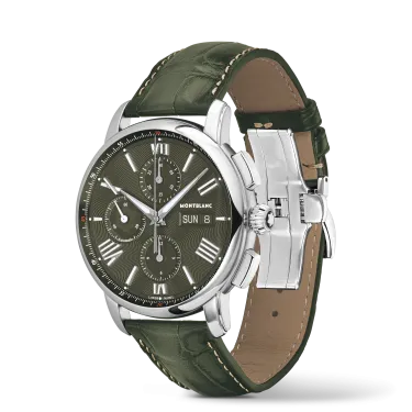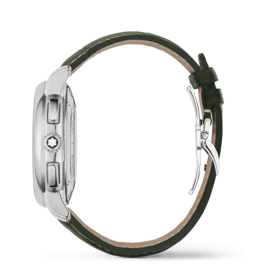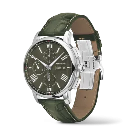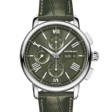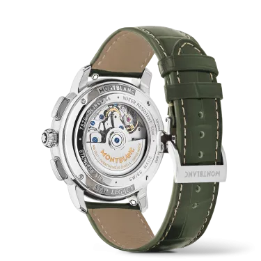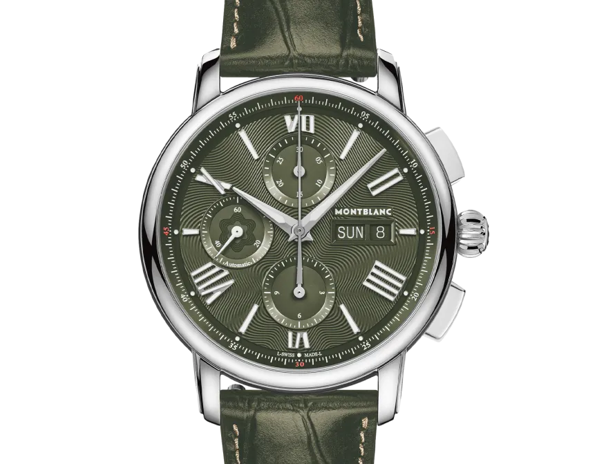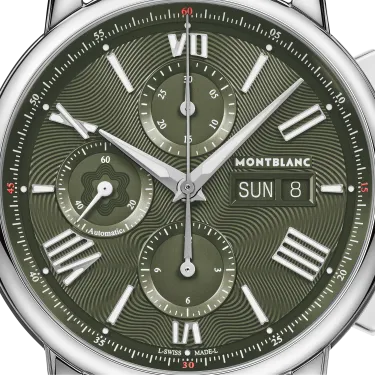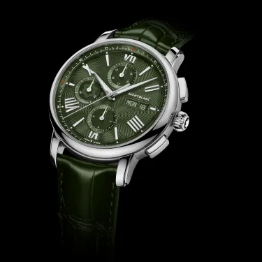 La Montblanc Star Legacy Chronograph Day & Date Limited Edition, limitée à 800 exemplaires, s'inspire des montres de poche Minerva de la fin du XIXe et du début du XXe siècle, avec leurs boîtiers ronds, polis, en forme de galet et leurs couronnes en forme d'oignon. Son magnifique cadran vert arbore le motif étoilé caractéristique de Montblanc, ainsi que des aiguilles et des chiffres en forme d'épée recouverts de rhodium. Elle est animée par le mouvement automatique MB 25.07 qui comprend un chronographe, le jour de la semaine et la date. Cette montre est également équipée d'un bracelet interchangeable en cuir de veau vert avec imprimé alligator et coutures écrues.