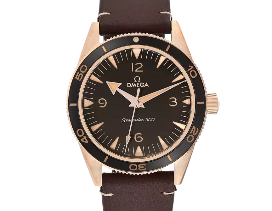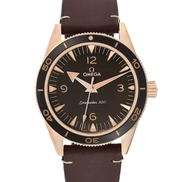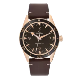Omega Seamaster 300 Co-Axial Bronze Gold 234.92.41.21.10.001. Mouvement à remontage automatique avec échappement Co-Axial. Certifié Master Chronometer, approuvé par METAS, résistant à des champs magnétiques atteignant 15'000 gauss. Balancier Freesprung avec spiral en silicium, deux barillets montés en série, remontage automatique dans les deux sens. Fonction fuseau horaire. Finition spéciale de luxe avec vagues genevoises en arabesque. Réserve de marche : 60 heures. Boîtier rond en or bronze 9k de 41,0 mm de diamètre. Fond transparent en verre saphir d'exposition. Lunette tournante unidirectionnelle en or bronze 9k avec insert en céramique brune et échelle de plongée en Super-LumiNova vintage. Verre saphir bombé inrayable. Cadran brun avec index lumineux encastrés et chiffres arabes ouverts à 3, 6, 9 et 12. Aiguilles flèches lumineuses en or bronze PVD. Bracelet en cuir brun avec boucle ardillon en or 9k bronze.