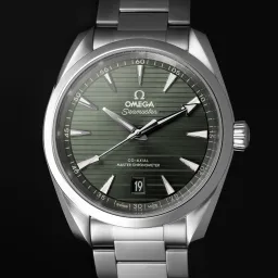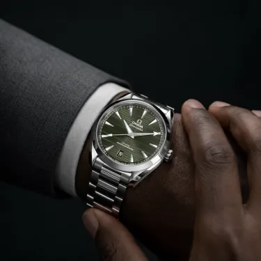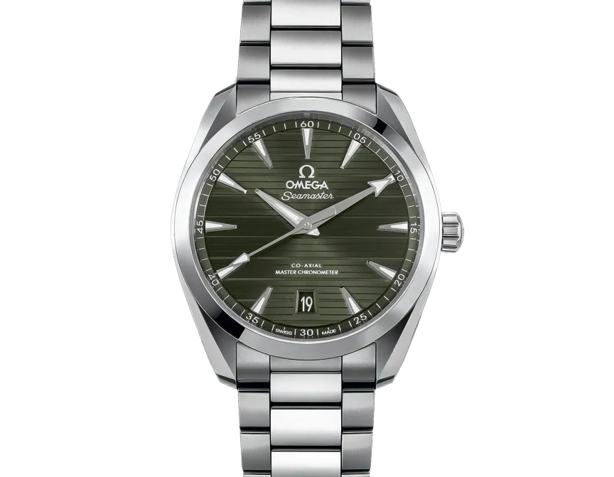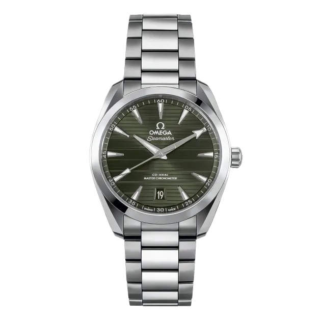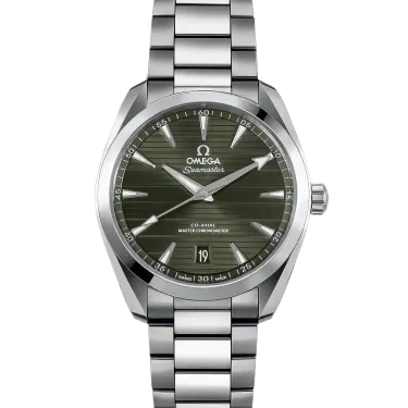 La Seamaster Aqua Terra constitue un magnifique hommage au vaste patrimoine maritime d’OMEGA. Au verso, le boîtier symétrique de 41 mm, façonné en acier inoxydable, est orné d’un motif vagues. Au recto, le cadran soleillé vert arbore un motif « teck » horizontal évoquant le pont en bois des yachts de luxe. Agrémenté d’aiguilles et d’index rhodiés revêtus de Super-LumiNova blanc, il affiche également un guichet de date à 6 heures. Présentée sur un bracelet poli et satiné, cette montre est entraînée par le calibre OMEGA Master Chronometer 8900 qui répond aux critères de performance les plus élevés de l’industrie horlogère, déterminés par l’Institut fédéral suisse de métrologie (METAS).