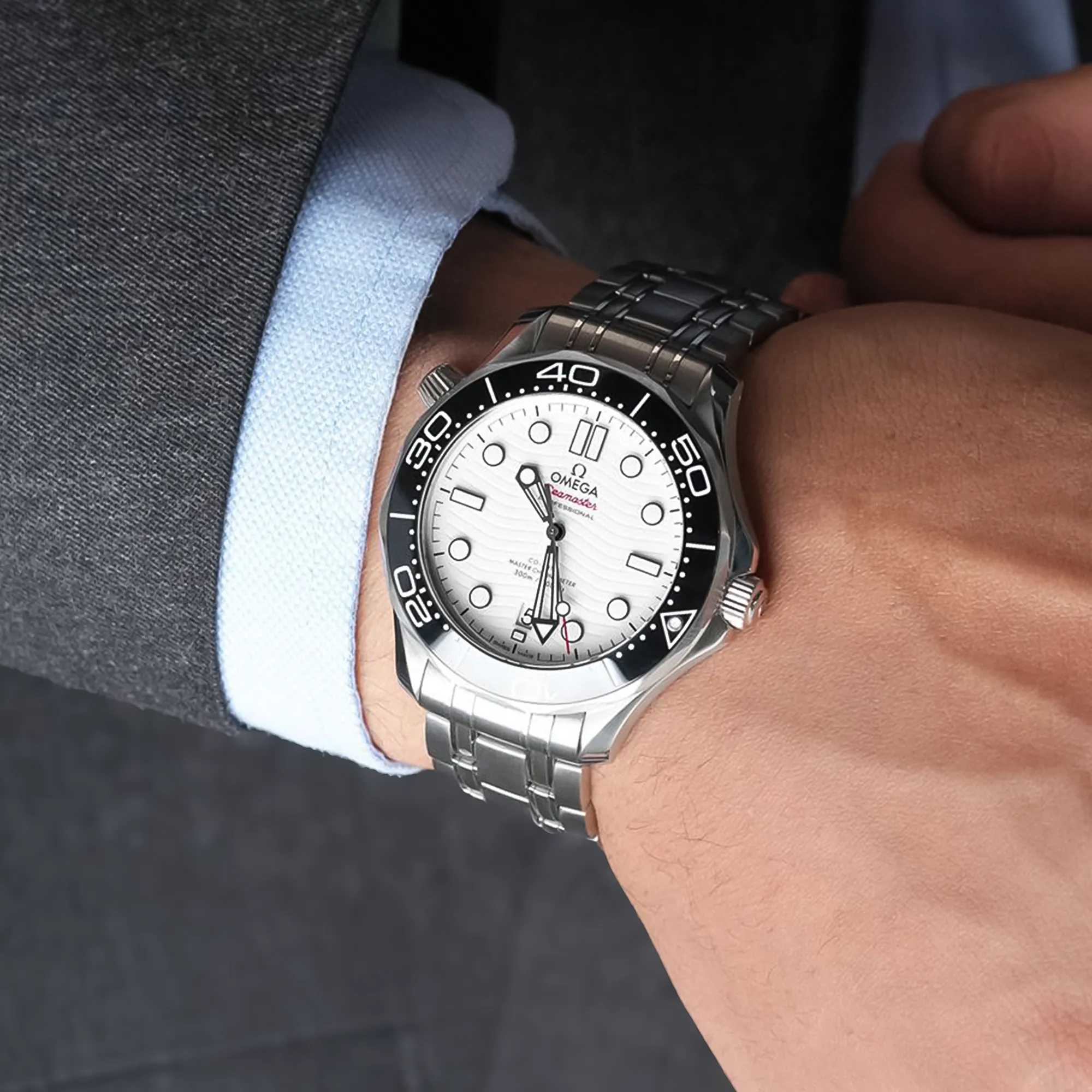 La Seamaster Professional Diver 300M est entrée dans la légende dès son lancement, en 1993. La collection contemporaine met à l’honneur son héritage maritime en le conjuguant avec le meilleur de l’innovation et du design OMEGA. Ce modèle de 42 mm en acier inoxydable est surmonté d’une lunette en céramique noire arborant une échelle de plongée en émail blanc. Le cadran en céramique blanche polie est décoré de vagues gravées au laser et de l’inscription « Seamaster » en rouge. Polies et squelettées, les aiguilles des heures et des minutes noircies sont revêtues de Super-LumiNova blanc. La pointe de l’aiguille des secondes est vernie de rouge. La montre est présentée sur un bracelet en acier inoxydable poli et satiné. Elle est entraînée par le calibre OMEGA Master Chronometer 8800, que l’on peut admirer à travers le fond en verre saphir à bords ondulés.